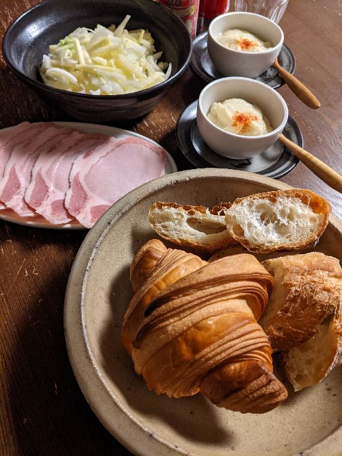 ビゴの店の生バゲットと、ゴントランシェリエのクロワッサンで晩ご飯。ゴントランシェリエはお久しぶりで、クロワッサンはこんな味だったかなぁと思い返しながら食べた。意外にしっとりもっちり系でほんのり甘い生地だった。そのままよりも、サンドイッチで食べるのが似合いそう。