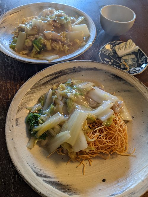 昨日下半分(軸の部分)を使った白菜1/4の残りと豚バラ肉で皿うどん。これから春先まで白菜は安いので、せいぜいたくさん食べようと思う。