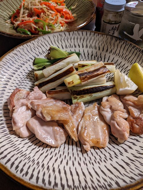 宮川食鳥鶏卵で買ってきたお肉で晩ご飯。とりあえず、特上若どり(もも)に0.8%の塩を振って10分ほどおいたものを、ねぎと一緒に焼いて食べる。