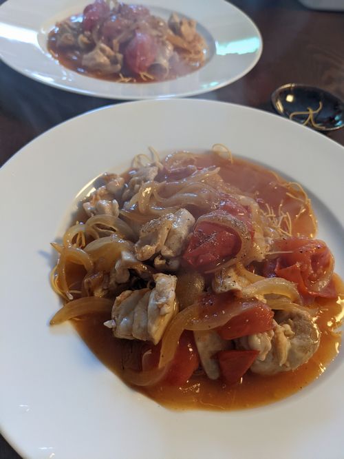 宮川の特上若どり(もも)とトマトを皿うどんの具に。普段は1回の料理に150グラムもお肉を使わないが、宮川の鶏はあっさりしているので全然余裕。むしろもっと食べられる。