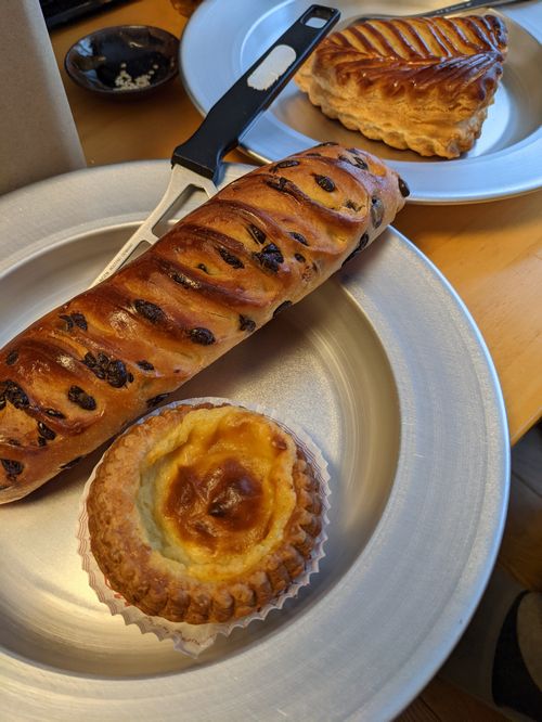 帰宅して、昼ご飯代わりに、ヴィロンで買ってきたパンを食べる。私はチョコチップが入ったヴィエノワ、夫はショーソンオポム。手前のニフレットは食べきれなくて夜にまわす。