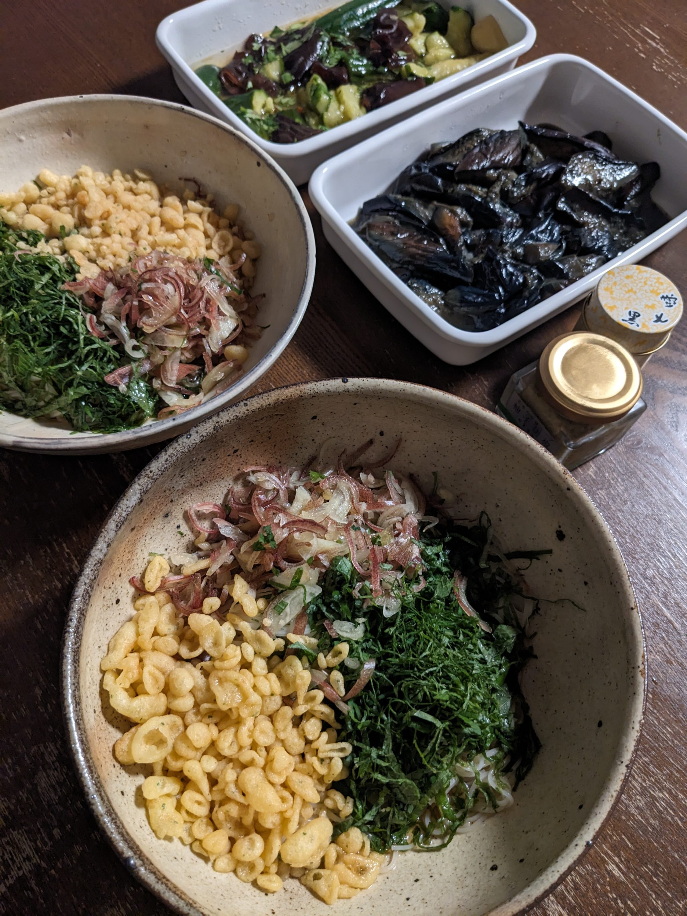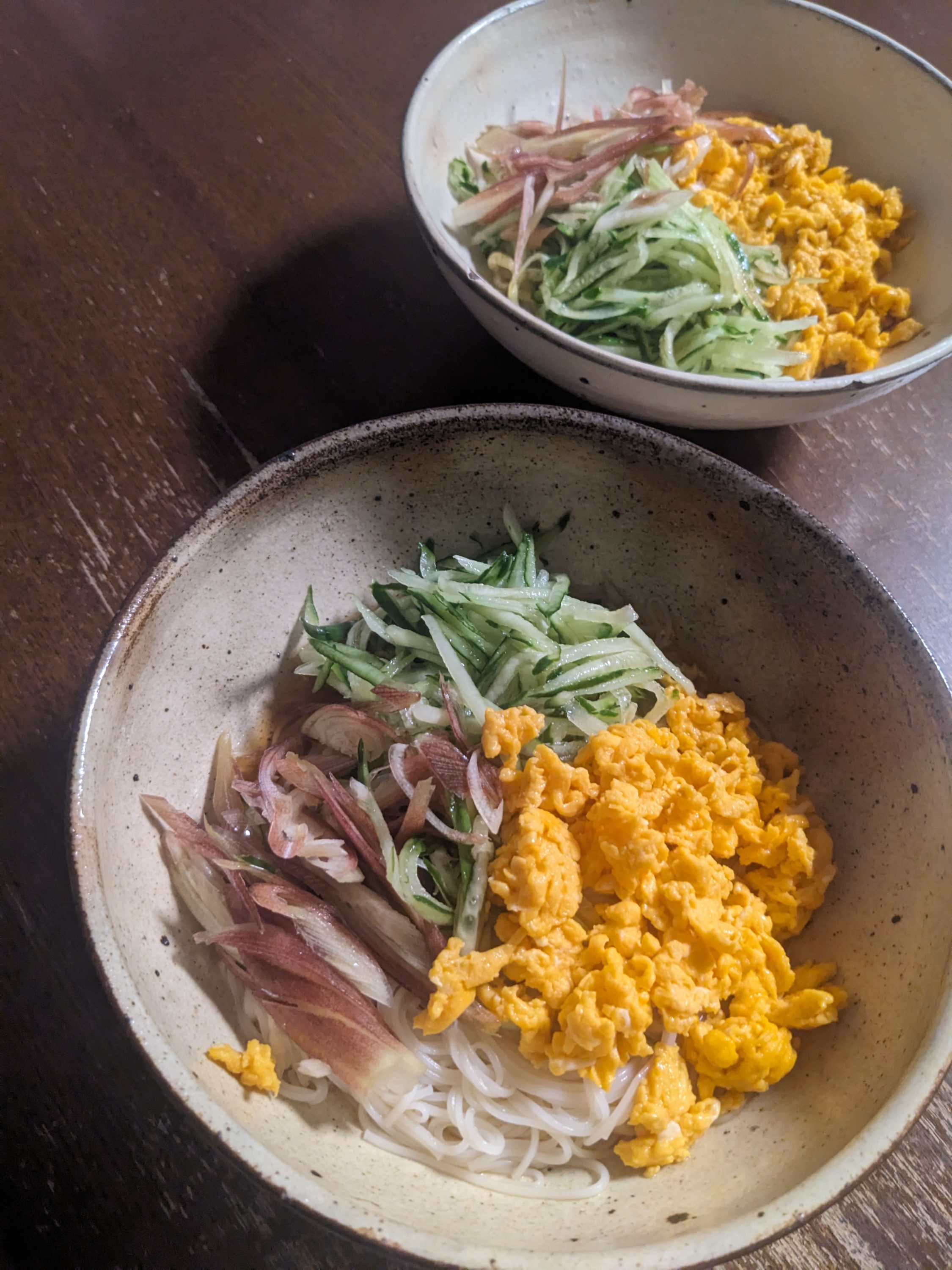 今日もそうめんぶっかけ。きゅうり、ミョウガの千切り、炒り玉子。私はヤマニの吟上を小さじ2杯、夫には創味のつゆを適当に割ってかけた。