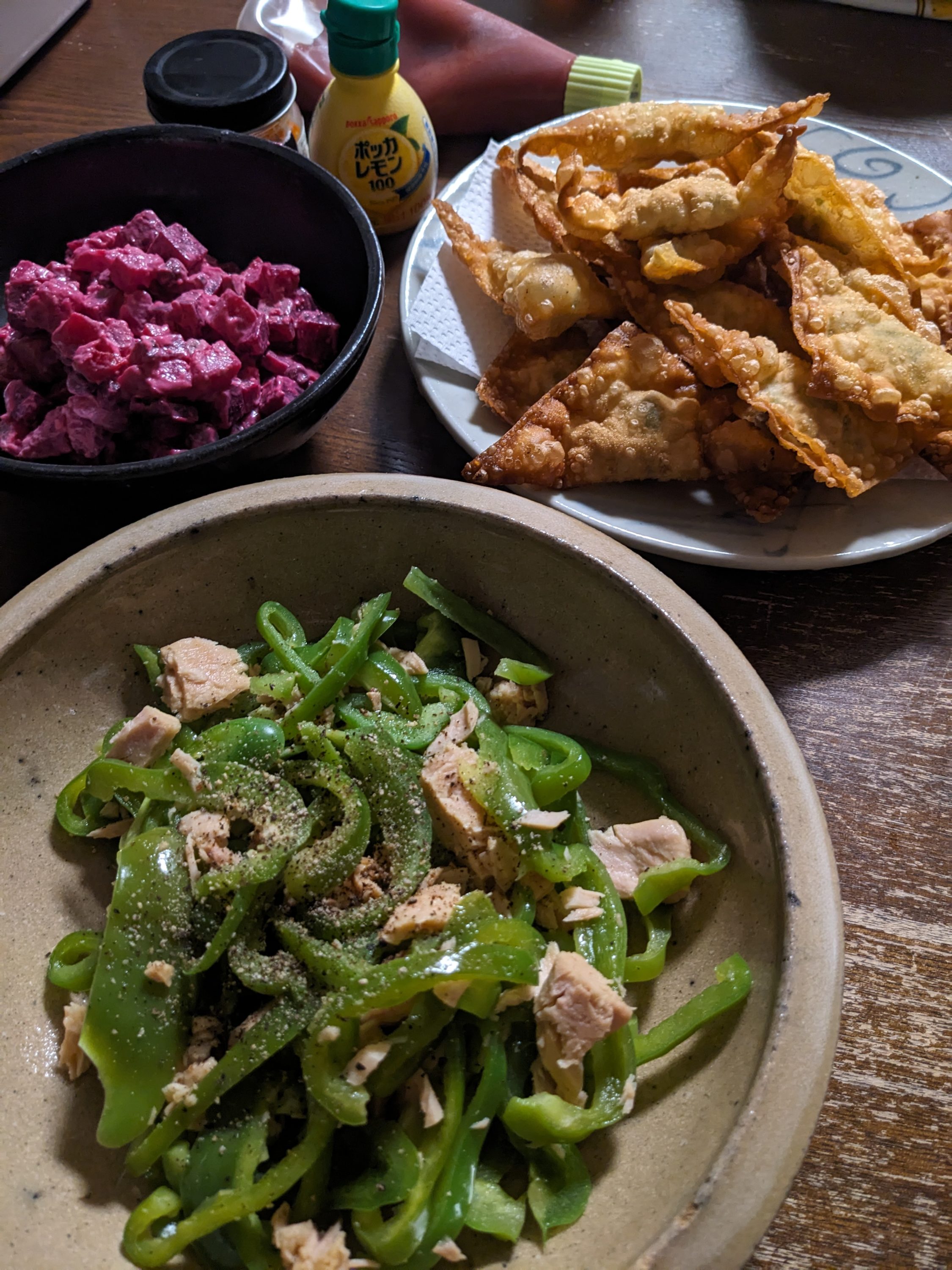 バナメイ海老、生姜のみじん切り、香菜をざっくり叩いて、包んで、揚げるだけ。なんだけど、ワンタンの皮って伸びないのであんまり具を包めず、数を包まなくてはいけないので、想像していたよりも手間がかかった。色々包み方も考えたが、結局、三角に折りたたむのが一番ラクなので、そういうことで。揚げ温度は160度で始めたが、それでも少し高いようだったので、150度まで下げた。それくらいがちょうどいいようだった。『高山なおみの料理』に似たような料理があって参照していて、下味もつけずに作っていて、それでいいんだと参考に作ったけど、やっぱり、下味はそれなりにつけた方がいいなとは思った。